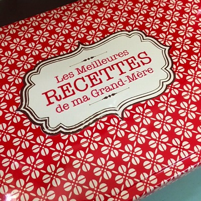 フランス語でレシピの意味「Recettes」が記された、お洒落なティン缶。